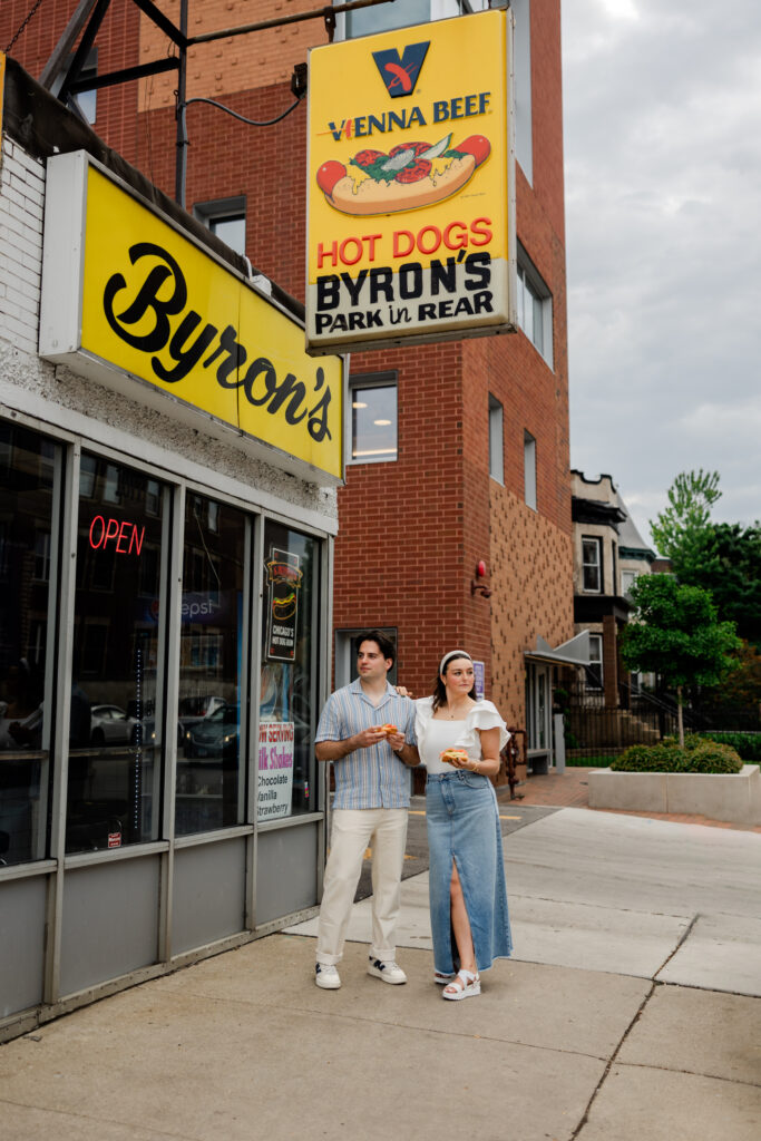 Next, we went to their favorite hotdog joint, Byron’s Hot Dogs, a cherished spot where many of their meals together took place. The bustling atmosphere and delicious food added a personal touch to their session! Our next stop was Union Station, where the grandeur of the architecture offered a timeless elegance to their portraits. Walking along the Riverwalk, we captured candid moments of joy against the serene waters and urban landscape. Finally, we ended our day at North Avenue Beach, walking along the Chicago skyline and chasing the birds on the beach. This engagement session beautifully encapsulated the essence of their love in the city they adore!
